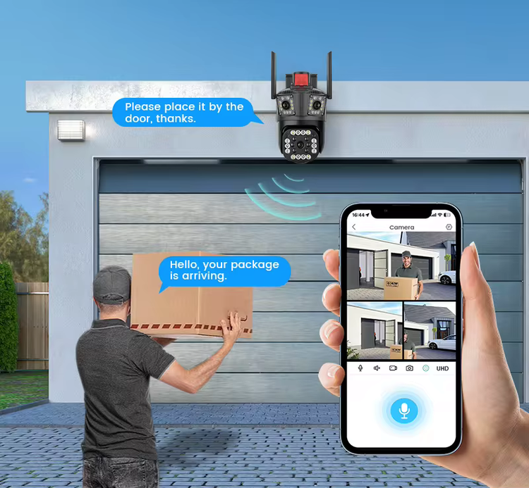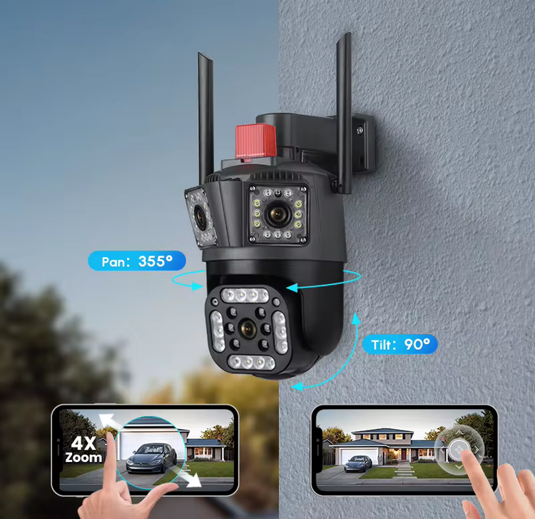 دوربین مداربسته اسپیددام 3 لنز وای فای ;کیس بزرگ مدل PTZ camera ، با وضوح تصویر 8مگاپیکسل در مجموع و با نرم افزار محبوب V380 طوری طراحی شده است که شما میتوانید با استفاده از مودم به راحتی محیط خود را از راه دور بر روی گوشی با3لنز واید دو عددبه صورت ثابت یکی واقعی و یکی مجازی و دیگری به صورت چرخان مشاهده کنید یعنی شما با نصب یک دوربین سه فضای مجزا را میتوانین کنترل کنین و با چرخوانرن دوربین فضایی را از دست ندهین و دوربین را به صورت 355 درجه در محور افقی و 120 درجه در محور عمودی بچرخانید. همچنین این دوربین این قابلیت رو دارا می باشد که تصاویر و صدا را بر روی micro SD ( رم موبایل ) ضبط کند و انتقال دهد ، قابلیت پشتیبانی تا 128 گیگ رم را دارد و جنس بدنه این محصول از PVC مقاوم ساخته شده است ، قابلیت های مهم این دوربین : پایه ی دو حالته ، نصب به صورت دیواری و سقفی،پایه ی متحرک برای تغییر وضعیت لنز ثابت،پروژکتور قدرتمند و iR (مادون قرمز) برای دید در شب فوق العاده در شب به صورت رنگی ، ضدآب بودن بدون محدودیت نصب در هر مکانی ، دزدگیر حرفه ای با قابلیت ارسال پیام هشدار ، توانایی دیدن تصاویر و صدای ضبط شده به صورت همزمان در نرم افزار است ،