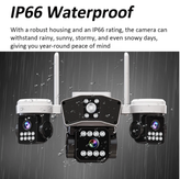 IP66 نشاندهنده مقاومت بسیار بالا در برابر نفوذ گردوغبار (سطح ۶) و فشار مستقیم آب از هر زاویه (سطح ۶) است. بهعبارتی، این دوربین برای استفاده دائمی در فضای باز طراحی شده—بدون نیاز به پوشش یا نگهداری ویژه.