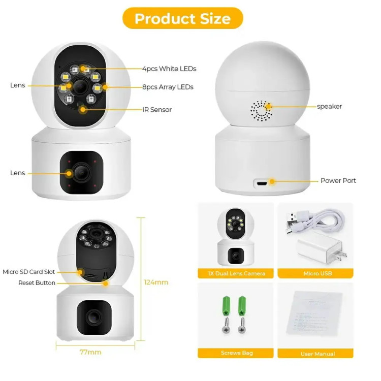 دوربین دو لنزه چهار مگاپیکسل به صورت دام طراحی شده است و یکی از دوربینهای امنیتی خانگی باکیفیت به شمار میآید. این دوربین از بدنهای مقاوم و قدرتمند برخوردار شده است که در سطح آن میکروفون و دو لنز باکیفیت دوربین قرار دارند. این لنزها کیفیت ۴ مگاپیکسل را ارائه میدهند. لازم به ذکر است که این دوربین هوشمند به صورت تحت شبکه طراحی شده و از اپلیکیشن ICSEE PRO پشتیبانی میکند. شما میتوانید با اتصال به وای فای دادههای این محصول را منتقل کنید و از راه دور نیز به دادهها دسترسی داشته باشید. در کنار این دوربین تجهیزاتی همچون سیم برق، استنت و بسته پیچ جهت نصب آسانتر ارائه میشوند.