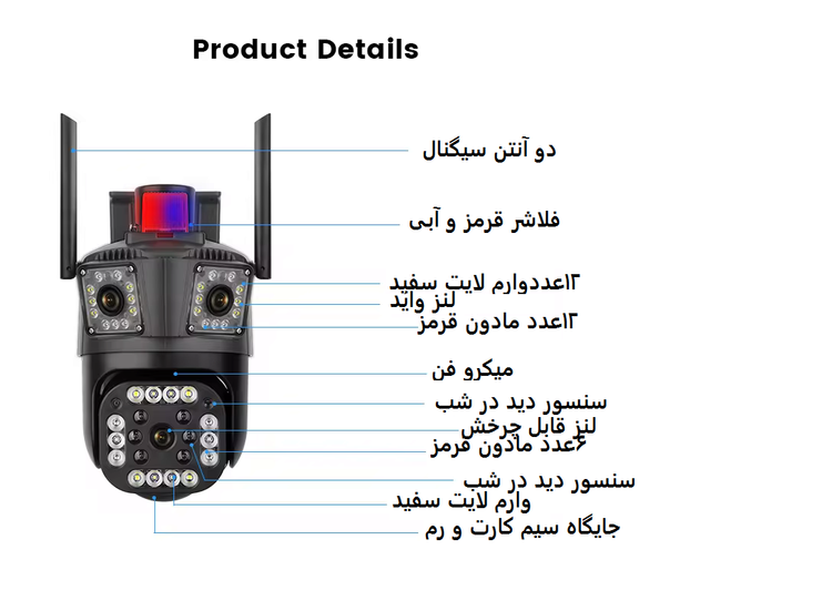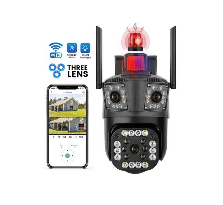 دوربین مداربسته اسپیددام 3 لنز سیم کارتی (4G) ;کیس بزرگ مدل 4G سیم کارتی PTZ camera ، با وضوح تصویر 8مگاپیکسل در مجموع و با نرم افزار محبوب V380 طوری طراحی شده است که شما میتوانید بدون استفاده از مودم و با قرار دادن سیم کارت داخل دوربین به راحتی محیط خود را از راه دور بر روی گوشی با3لنز واید دو عددبه صورت ثابت یکی به صورت مجازی و دیگری به صورت چرخان مشاهده کنید یعنی شما با نصب یک دوربین سه فضای مجزا را میتوانین کنترل کنین و با چرخوانرن دوربین فضایی را از دست ندهین و دوربین را به صورت 355 درجه در محور افقی و 120 درجه در محور عمودی بچرخانید. همچنین این دوربین این قابلیت رو دارا می باشد که تصاویر و صدا را بر روی micro SD ( رم موبایل ) ضبط کند و انتقال دهد ، قابلیت پشتیبانی تا 128 گیگ رم را دارد و جنس بدنه این محصول از PVC مقاوم ساخته شده است ، قابلیت های مهم این دوربین : پایه ی دو حالته ، نصب به صورت دیواری و سقفی،پایه ی متحرک برای تغییر وضعیت لنز ثابت،پروژکتور قدرتمند و iR (مادون قرمز) برای دید در شب فوق العاده در شب به صورت رنگی ، ضدآب بودن بدون محدودیت نصب در هر مکانی ، دزدگیر حرفه ای با قابلیت ارسال پیام هشدار ، توانایی دیدن تصاویر و صدای ضبط شده به صورت همزمان در نرم افزار است ، قابل ذکر است که همینطور که در تصاویر دوربین مشاهده می کنید ماژول سیم کارت در داخل دوربین قرار داده شده که پس از راه اندازی دوربین داخل نرم افزار علامت 4G که نشان دهنده کالای اصل است در داخل نرم افزار نمایش داده می شود، در همین راستا شرکت سفیر دوربین تلاش کرده که کالای اصل و ریجستری شده را برای مشتری ارسال کند.